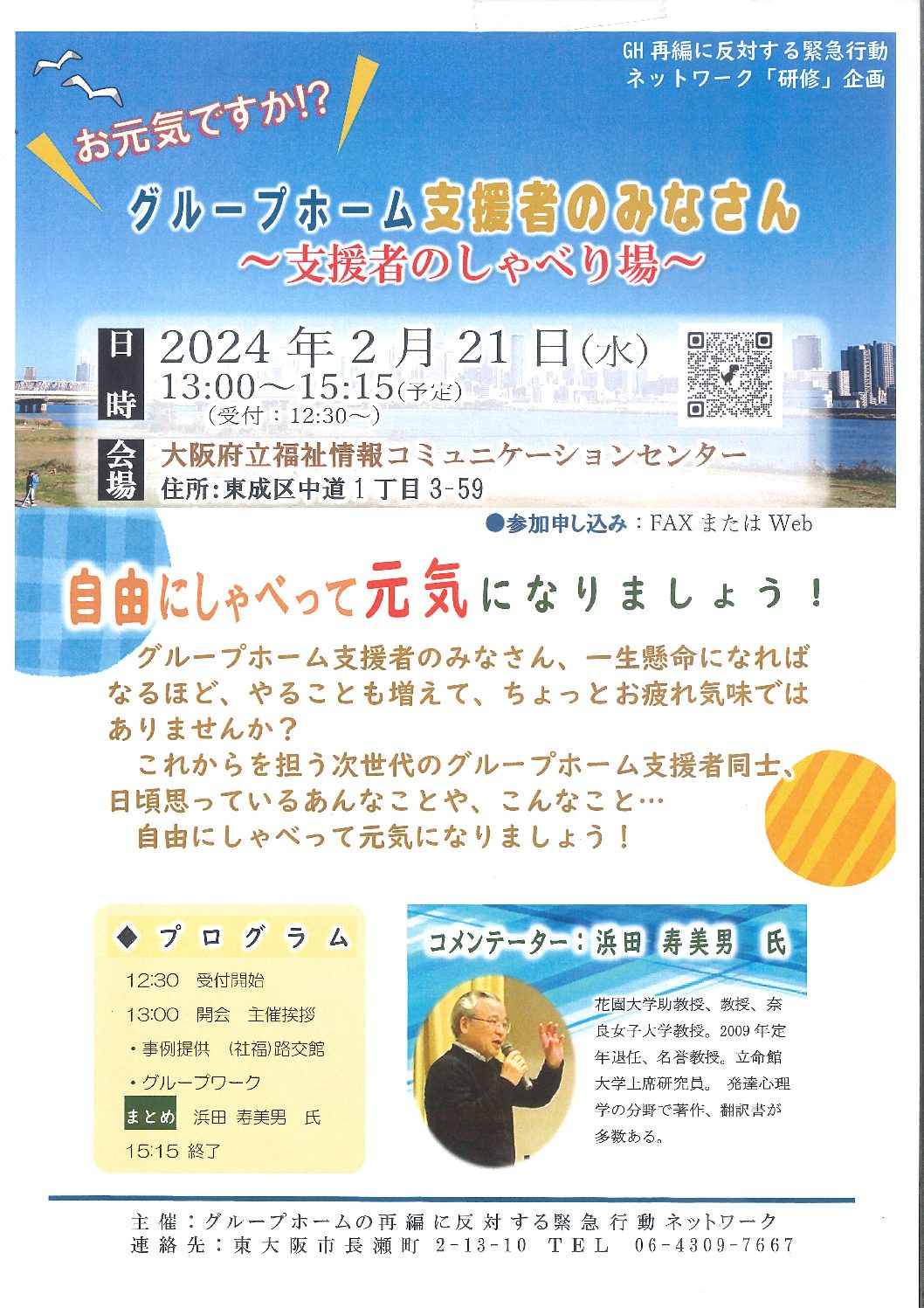 グループホームの再編に反対する緊急行動ネットワークから研修のご案内です。 グループホーム支援者のみなさん~支援者のしゃべり場~ これからを担う次世代のグループホーム支援者同士、日頃思っているあんなことや、こんなこと・・・ […]