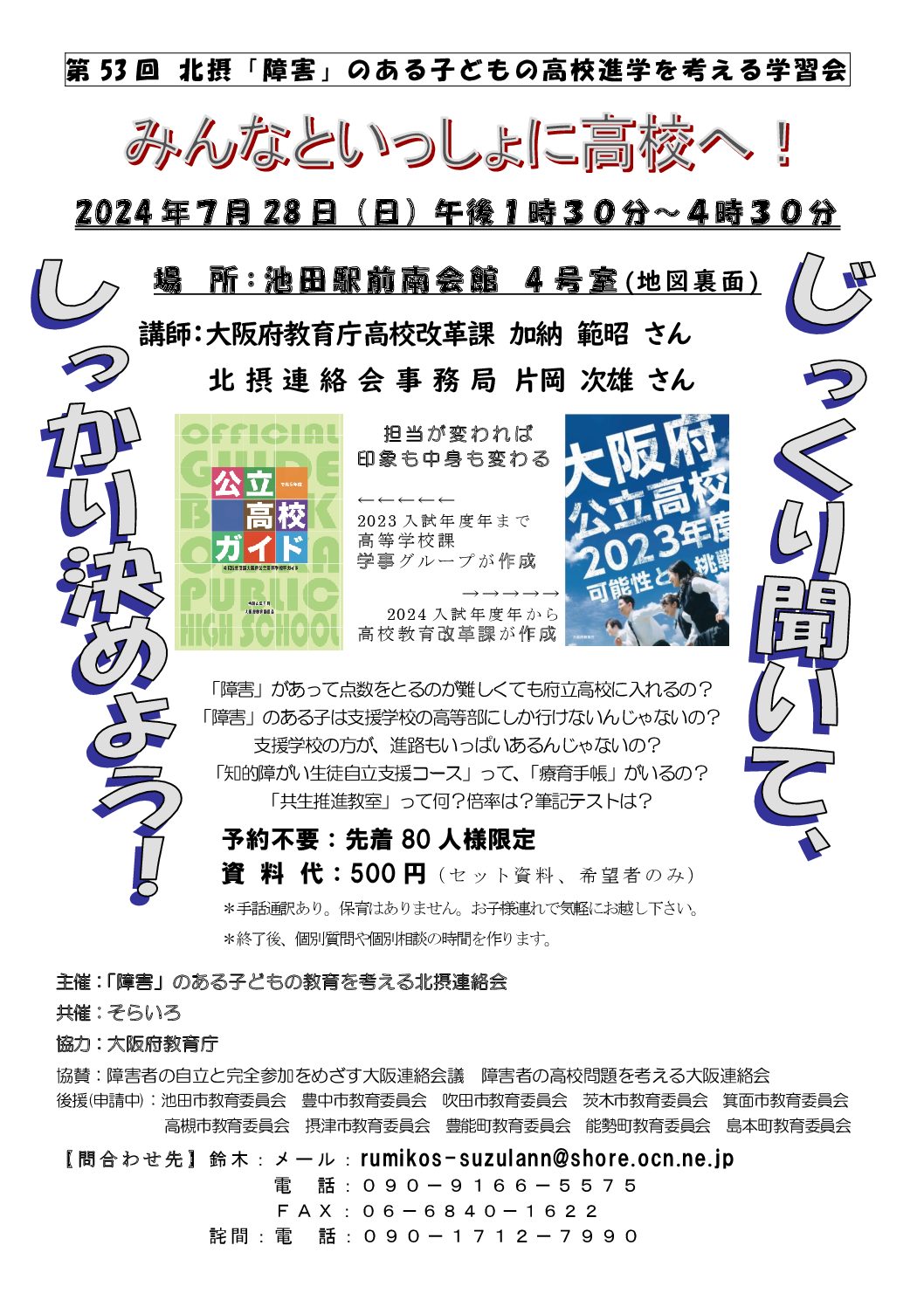 第53回 北摂「障害」のある子どもの高校進学を考える学習会 みんなといっしょに高校へ 今回は池田市で開催されます。 先着80名限定。資料代500円。手話通訳あり。終了後、個別質問や個別相談の時間もあります。